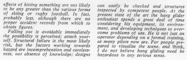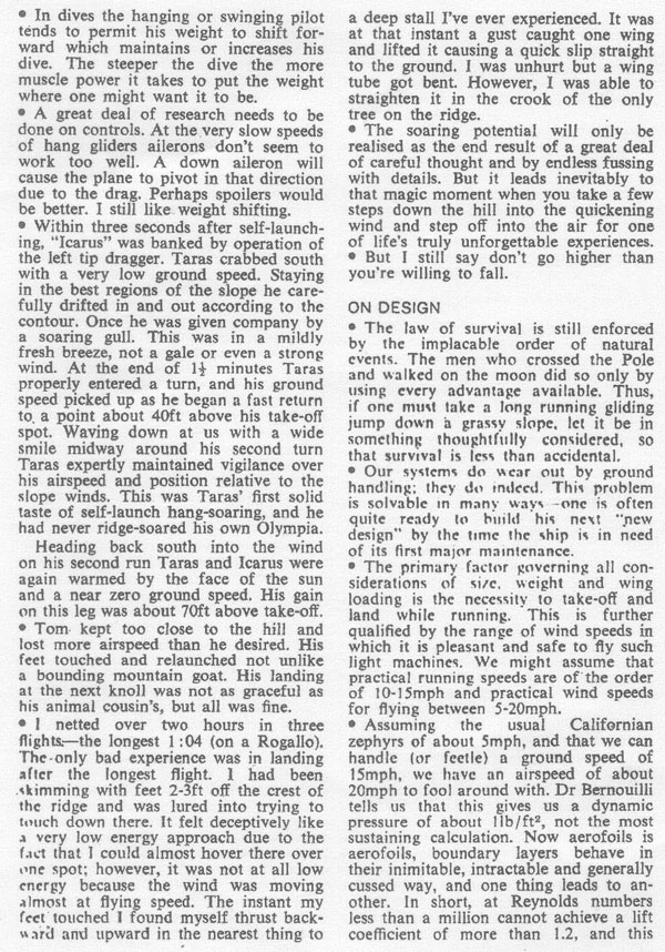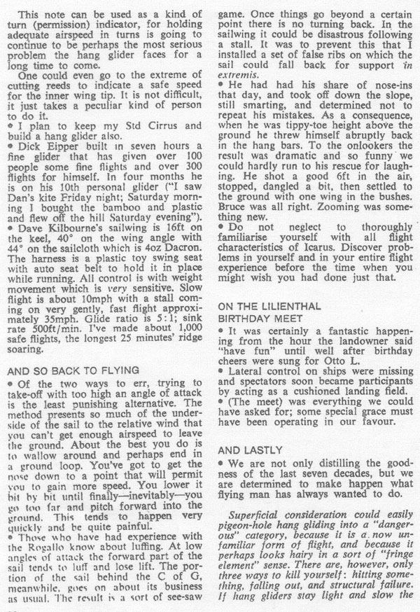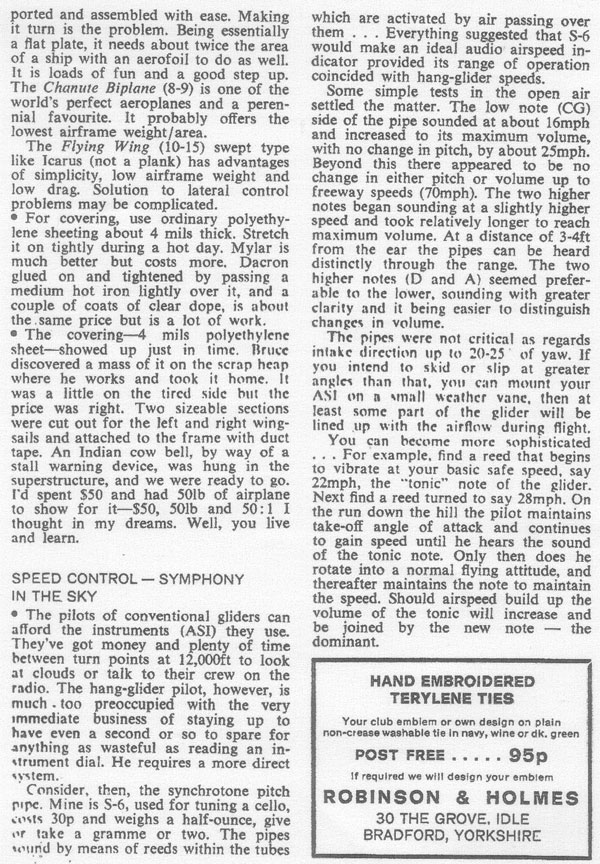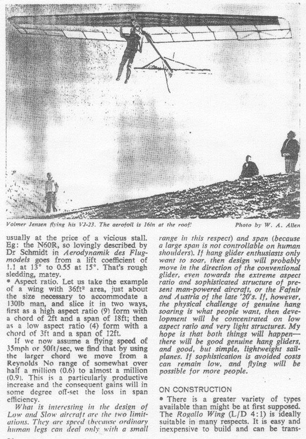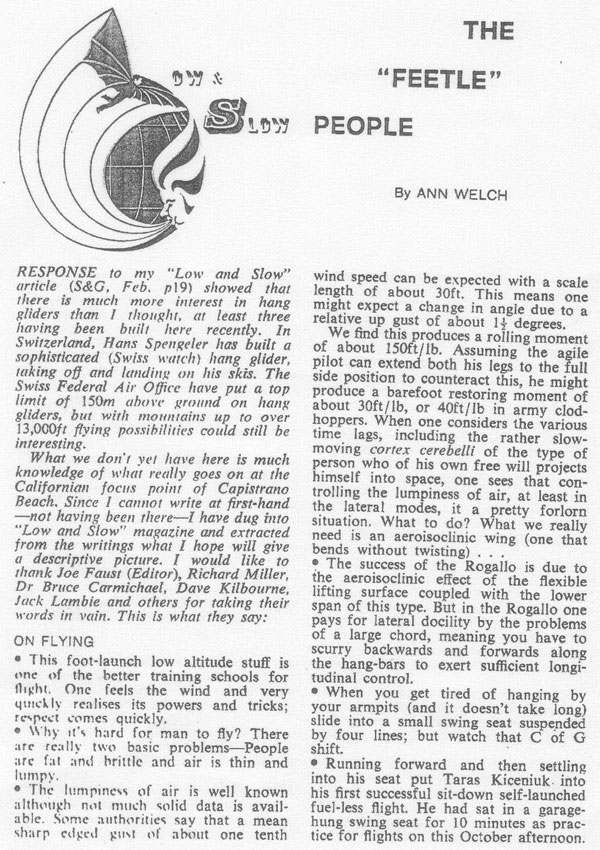 The following is an article by Anne Welch that appeared in the April/May 1972 issue of 'Sailplane & Gliding' magazine. After her earlier article in the same magazine (Feb/March) it seems she received quite a lot of correspondence and information from people all over the country and also under took her own research, on the subject of hang Gliders arriving in the UK from America. At the start of this article she mentions that she knows of at least three gliders having already been built. Such a pity she does not mention their names. Going out on a limb I’m assuming that she is referring to Geoff Mcbroom, Dave Watts and possibly the Haynes brothers who went on to form the 'Waspair' hang glider company. Although I have to also take on board the possibility that Anne could have been referring to Tony Prentice from Kent, who was also building at that time, although Tony's gliders at that time were constructed of bamboo and used a parallel bar system. To Anne he was building a hang glider. Tony was also building an Otto Lilienthal replica around that same time, so it’s quite possible that she might have also heard about the replica. After reading her first article when she visited the USA, anything that had a pilot hanging from it was classed as a Hang Glider.