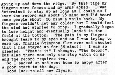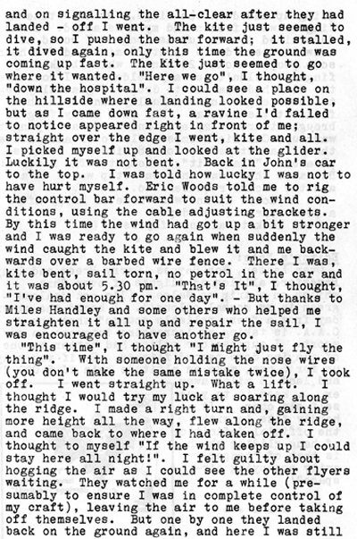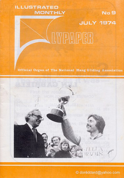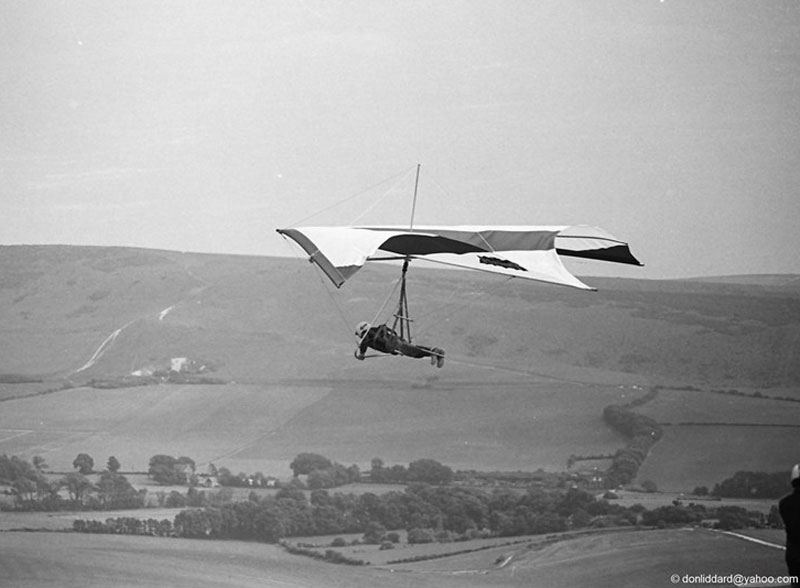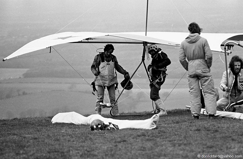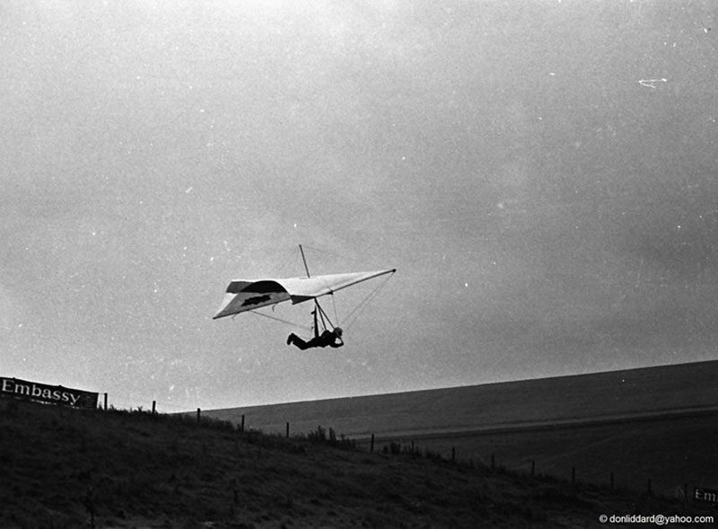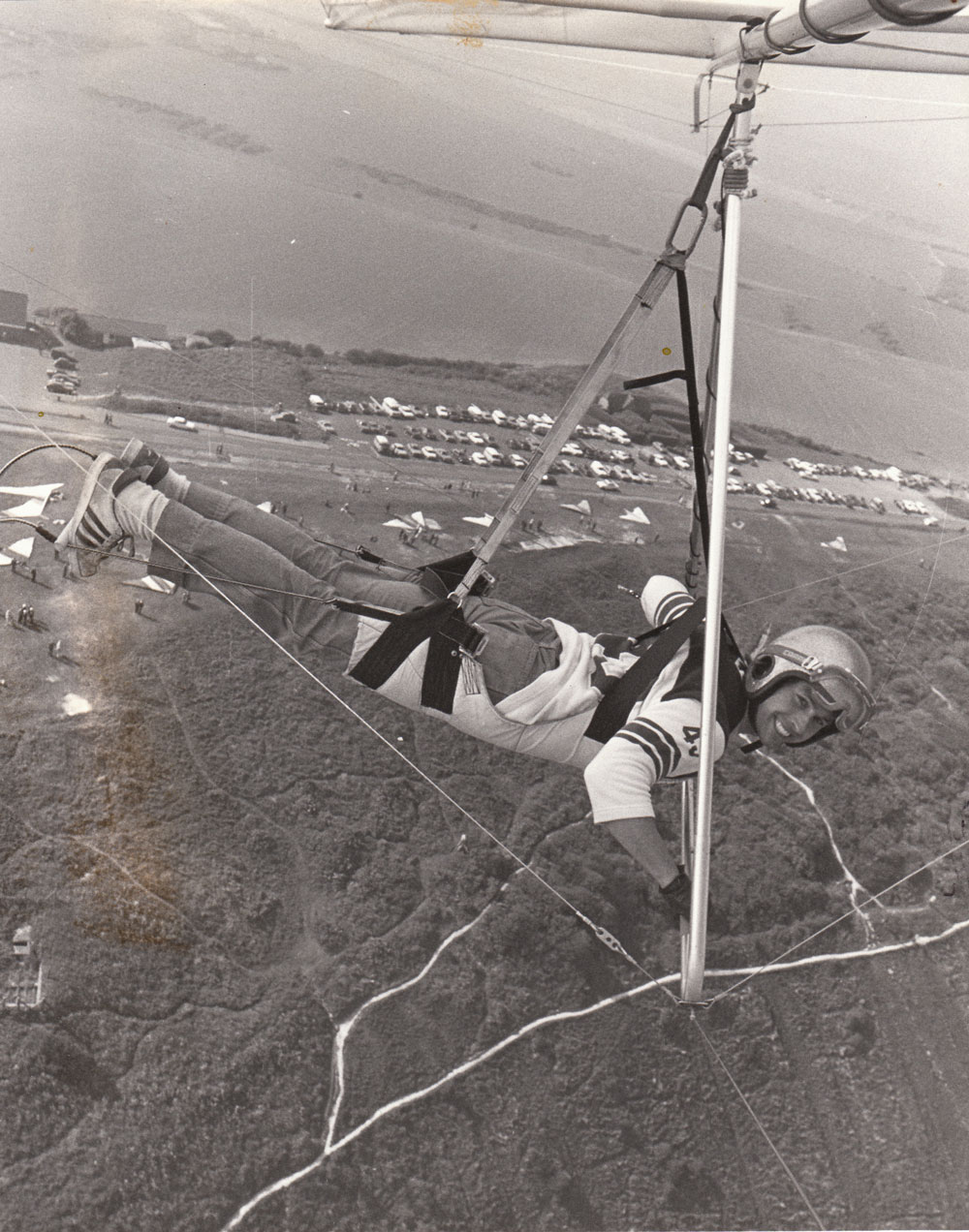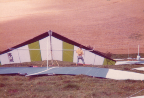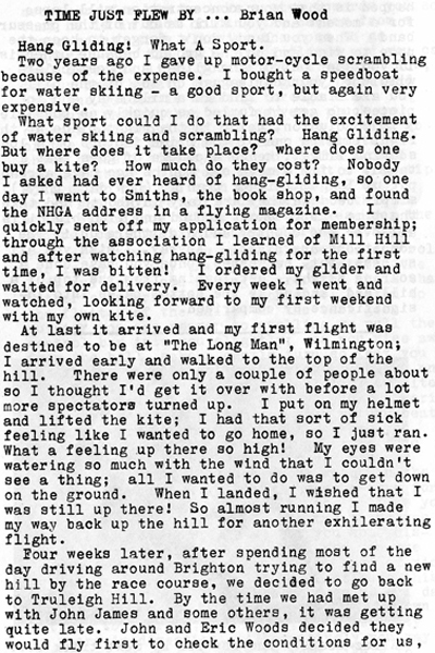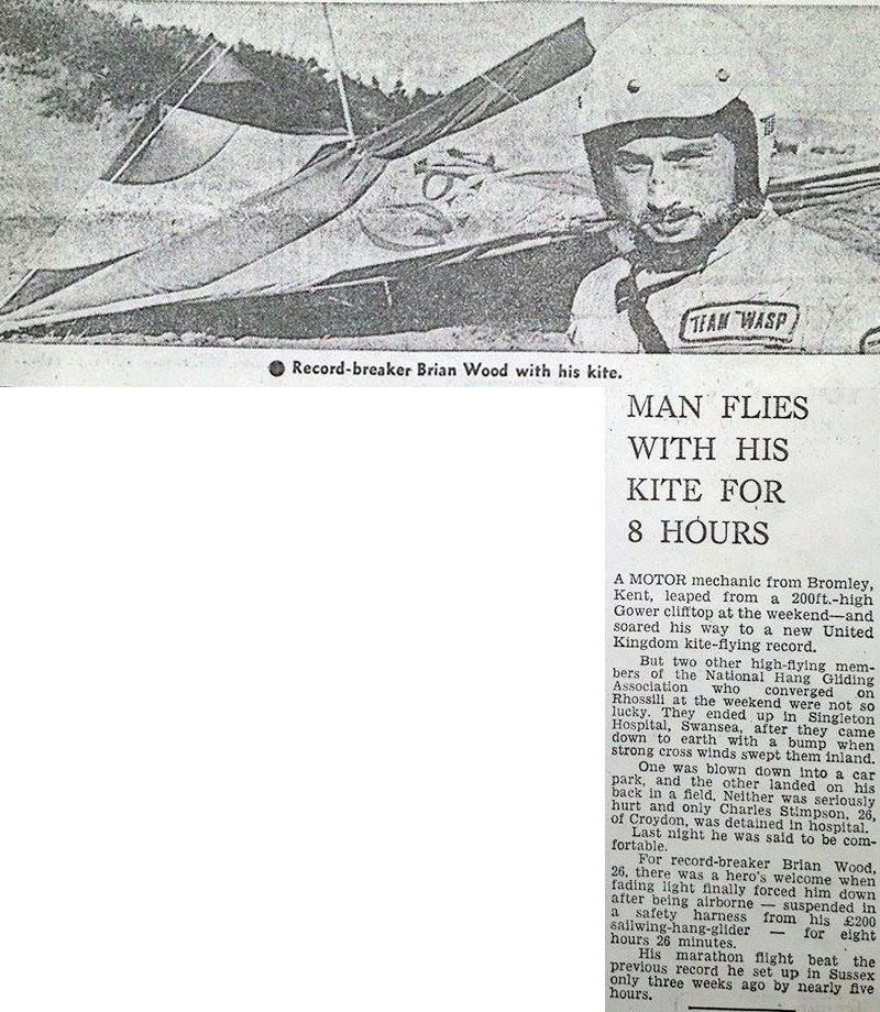 Brian Wood Brian was the first Hang Glider pilot to pass a Pilot Licence exam in the UK, and its believed that Tony Fuel was his examiner. Although Chris Corston, who was Secretary of the BHGA at the time, marked him down as pilot No 2, and was extremely sorry about it. 1974. He was the first person to soar for 35mins, on his 3rd week-end of owning a glider. When only top to bottom flights was being enjoyed by the vast majority of the flyers at that time. 1974. He achieved a 3.5hrs flight at Beachy Head. 1974. While later he achieved 8.26mins at Rhossili. 1974. Its believed that Brian was the first pilot to perform a 360 degree turn, just before his Rhossilli endurance flight of 8.26minutes. The 360 degree turn went on to become a common maneuver by almost all hang glider pilots. 1974 He won the first ever 'British Hang Gliding Championship’. 1974. Winning the class 2 in the first ever ‘International Championship’. 1976. He was the first pilot to feature in a TV commercial flying a Hang Gliding, for the ‘Blue Stratos’ After Shave commercial. 1977. He won the first ever British League Competition. He was a top finishing pilot in many competitions in the UK and abroad. Having taught hundreds of people to fly in the UK and abroad, is something he can and is very proud of. I'm sure that during those early years many remember Brian and looked upon him as an Idol, by setting the standards we all tried to copy (including myself) Many of the very early Hang Glider enthusiast will remember that it was Brian who was the Founder of the ‘Yellow Wellies Craze’. if you were not flying during those early years you will not know what I'm talking about There is so much more Brian should be credited with, for helping making Hang Gliding into the popular sport it became. The whole of the Hang Gliding family was as surprised as myself, when Brian disappeared from the flying sites in the UK? There is so much more under took during those brilliant flying days, and maybe had more success than any other pilot at that time. (Terry Aspinall 2018) To enlarge click on photo