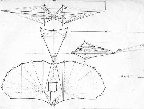 I have endeavored to recapture this dram by returning to the pre-Wright brother’s era, the days of the Bird-man. My main inspiration has come from the German pioneer Otto Lilienthal and his English emulator Percy S, Pilcher. They both conducted their flying experiments during the 1890’s with wings like those of a bird. Examples of these can be seen in the Science Museum. South Kensington.
