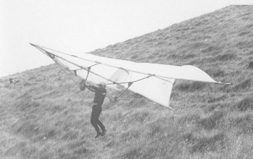 In the summer of 1968 I took the glider to Brasted Hill in Kent for trials. This happens to be only a few miles from Eynsford where Pilcher tried his gliders. After much preparation it was ready for flight. I clambered underneath the wing, through the bracing wires and positioned myself in the framework. Then standing up, the weight of the machine supported by my arms and shoulders, I faced the wind. Nervously I started down the slope, the weight lessening with each stride, until the machine was born by the air. Running faster still unable to stop my feet barely touching until, I felt no longer the ground beneath my feet, but a force beneath my arms lifting.
