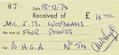 Before the ink was even dry on the official paper work, following the historic meeting in Coventry on the 8th December and the formation of the B.H.G.A. Membership applications were streaming in to the Monksilver Office. Below is No 54 that was issued to Mark Woodhams and the receipt is dated 18.12.74. Note the handsome sum of £4, oh they were the days