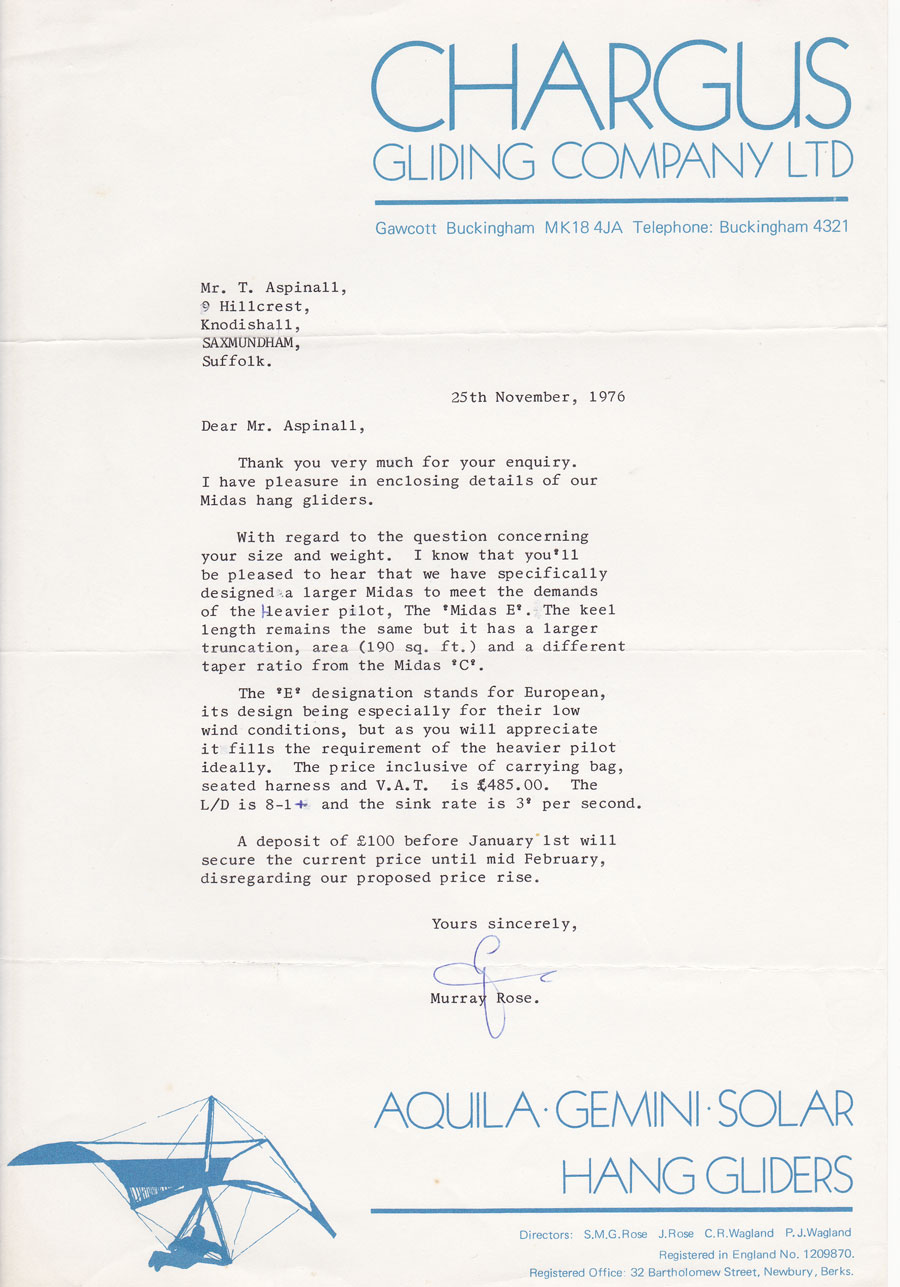A letter responding to questions about the 'Midas E' from Terry Aspinall 25th November 1976